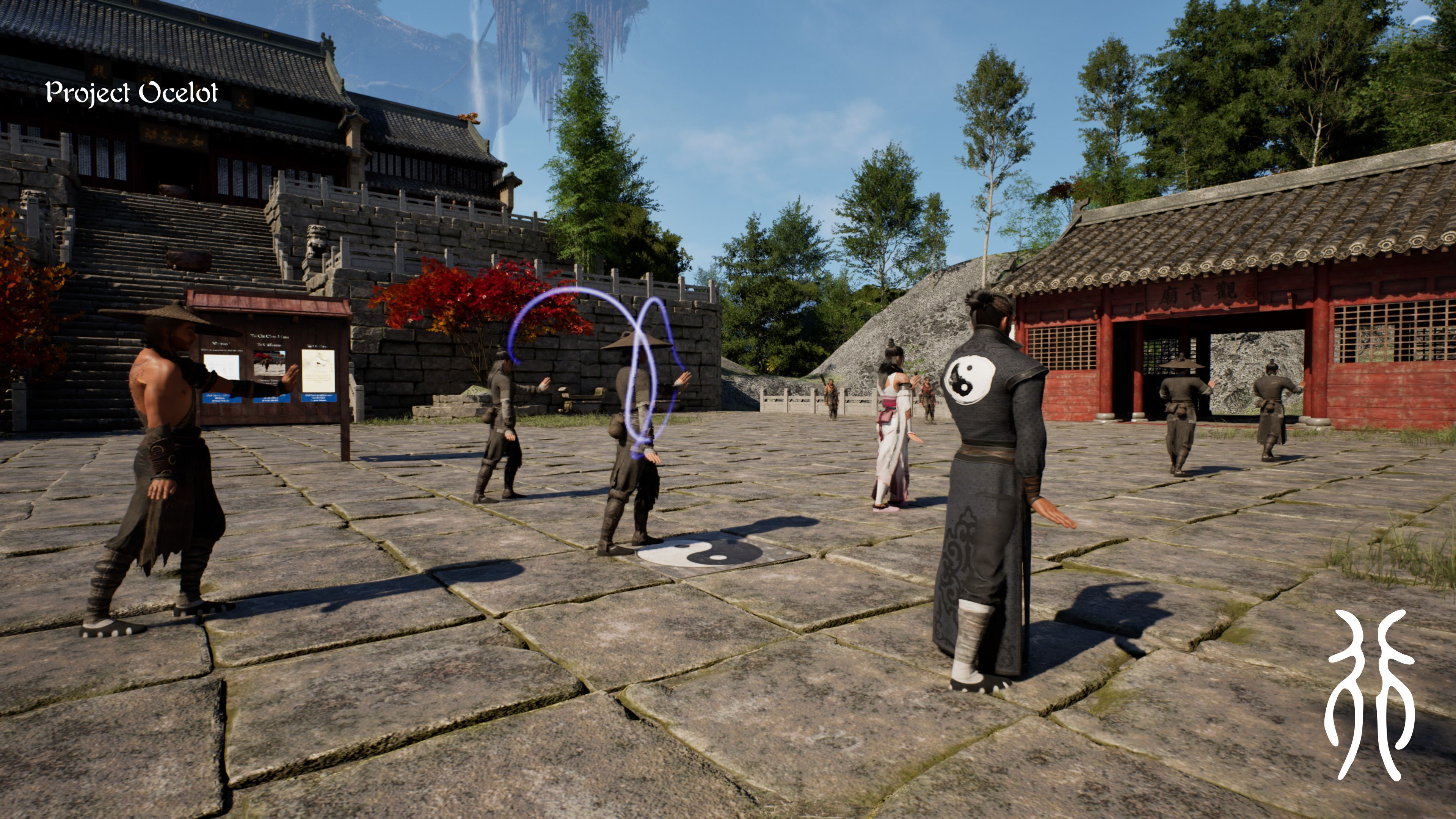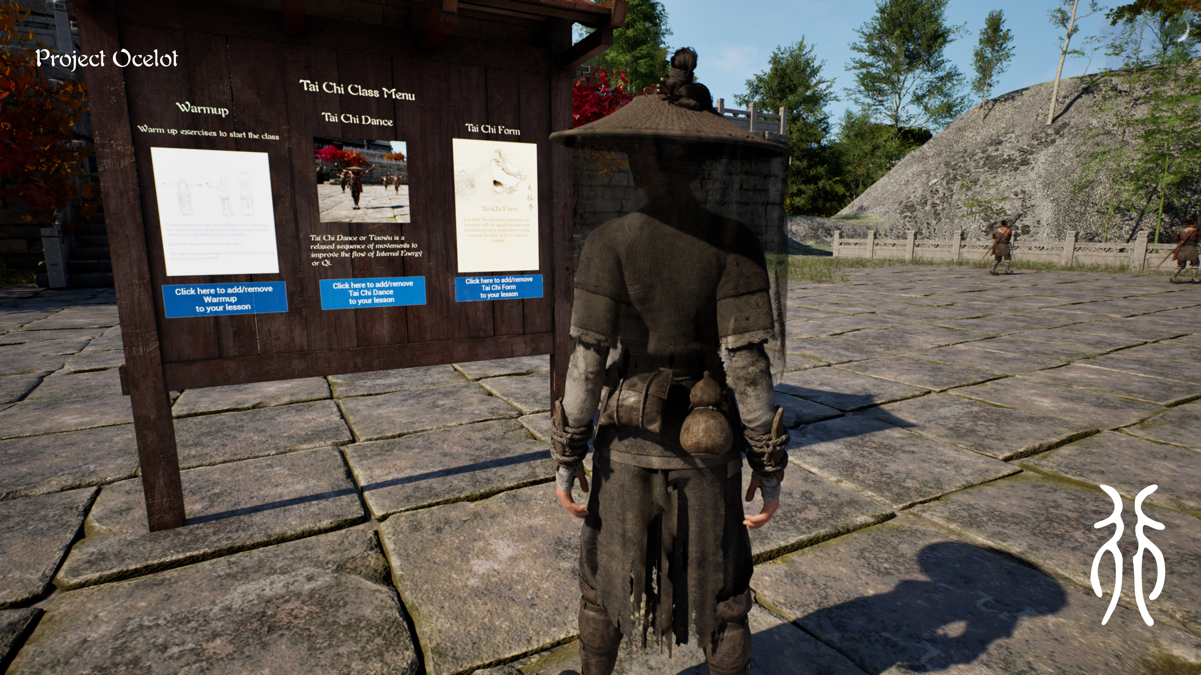 The game puts you in a temple courtyard. You choose a sequence from the noticeboard, step onto the practice stone, and the class begins. You can watch from any angle, zoom in on a hand position, slow it down, loop a section, or just run through the whole form start to finish.